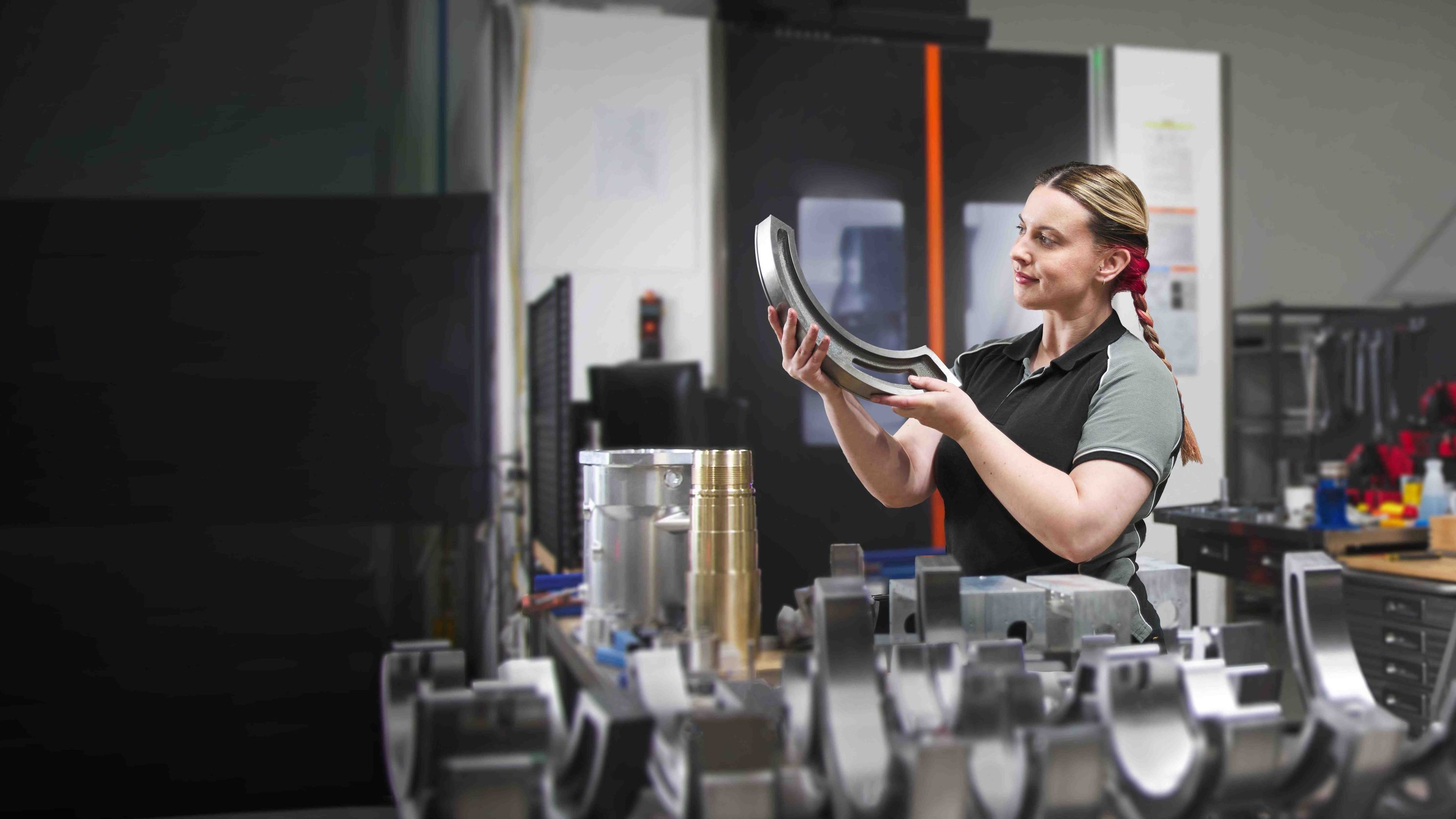 She started working for Axiom Precision Manufacturing in her third year of the apprenticeship, learning the fundamentals of defence industry manufacturing.